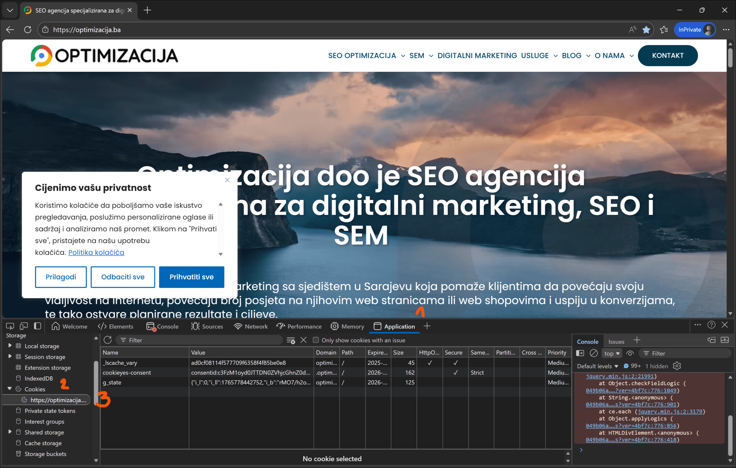Ispravno: Lista je prazna ili ima samo sistemske (npr. kao u slici ispod: nema _ga (Google Analytics-a), _fbp (Facebook Pixel-a) niti ads kolačića.. ). To se zove Prior Consent (prethodni pristanak). Podaci se ne smiju prikupljati dok korisnik ne kaže “DA”.